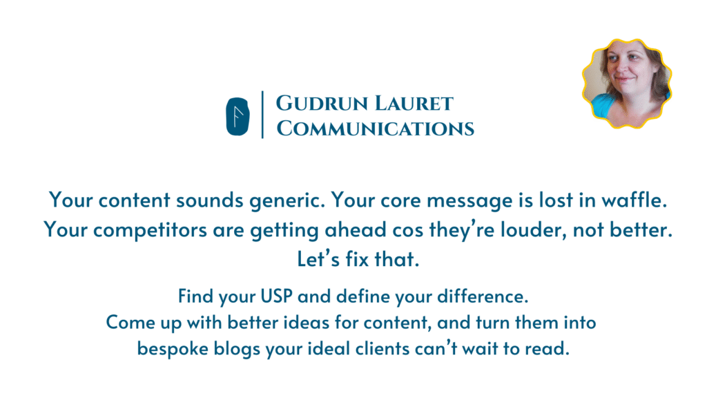 Want your online communications to really show people what matters to you? Whether you need help in defining your USP, you’d like help to come up with content ideas, or you want to get more consistent with writing blogs, I’ve got the solution for you. I’ve collected all of my offerings (free and paid-for) on one handy page. Click the button below to learn more.
